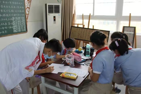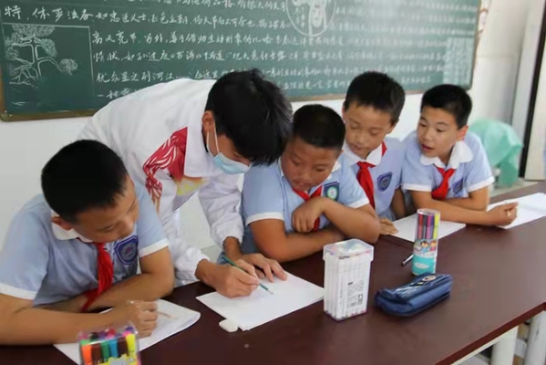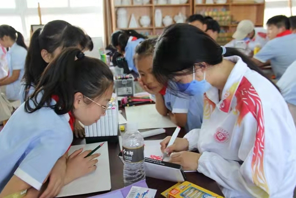 项目组一行首先在老峰镇中心学校会议室召开了座谈交流,项目主持人简要介绍了项目开展情况、项目组成员情况,此次活动方案,预期要达到的效果等,老峰镇中心学校沈良顺校长简要介绍了老峰镇中心学校校史、美术体育课程开设情况等。随后,永利官网艺术俱乐部部分优秀学生深入课堂,给五、六年级学生开展绘画、艺术体操等艺术实践教学活动。