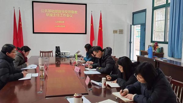 为贯彻落实学校关于督导工作的会议精神暨部署落实全年的教学重点工作任务,3月6号下午2:40,公共基础部在106会议室召开了本学期第一次督导反馈暨教研室主任工作会议,公共基础部总支班子成员、教学管理人员以及各教研室主任参加了会议,会议由公共基础部教学副主任王叙城主持。