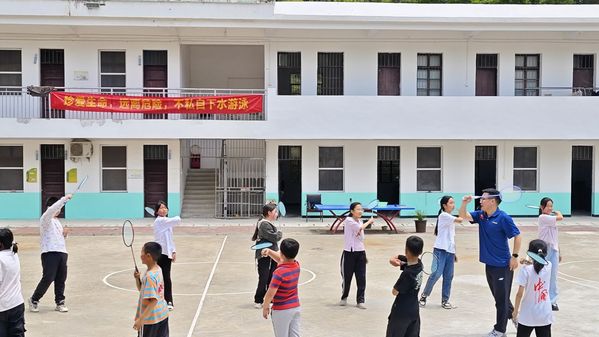 座谈会后,活动聚焦乡村教育关怀。安庆职院公共基础部向平岭村小学捐赠了一批体育器材,包括篮球、乒乓球拍、羽毛球拍、跳绳等物资。捐赠仪式上,张林鼓励学生强健体魄、勤奋学习。随后,双方共同参与了“体育大课间”活动,由教师张颢为学生们开展羽毛球基础教学,现场互动热烈,欢声笑语不断。