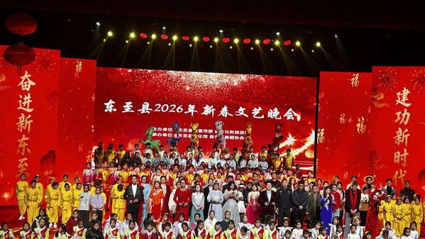 2月25日晚,以“奋进新东至,建功新时代”为主题的东至县2026年新春文艺晚会在该县文化中心大剧院盛大举办。由永利官网查艳、魏玲两位老师全程编导、来自全校六个学院56名学生联袂演绎的国家级非遗东至花灯舞节目《花灯欢歌庆丰年》精彩亮相本次晚会,演出取得圆满成功,获得主办方、现场观众及社会各界的一致好评与高度赞誉。